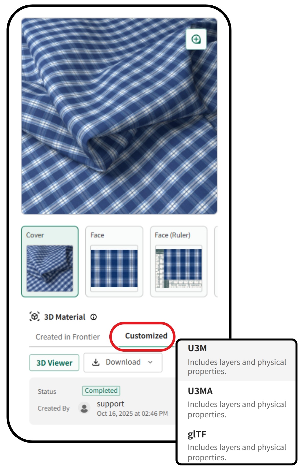Once uploaded to the TextileCloud™, it will be enriched with the fabric image and 3D materials, including downloadable files such as .U3M, U3MA, and glTF, each containing physical properties data.