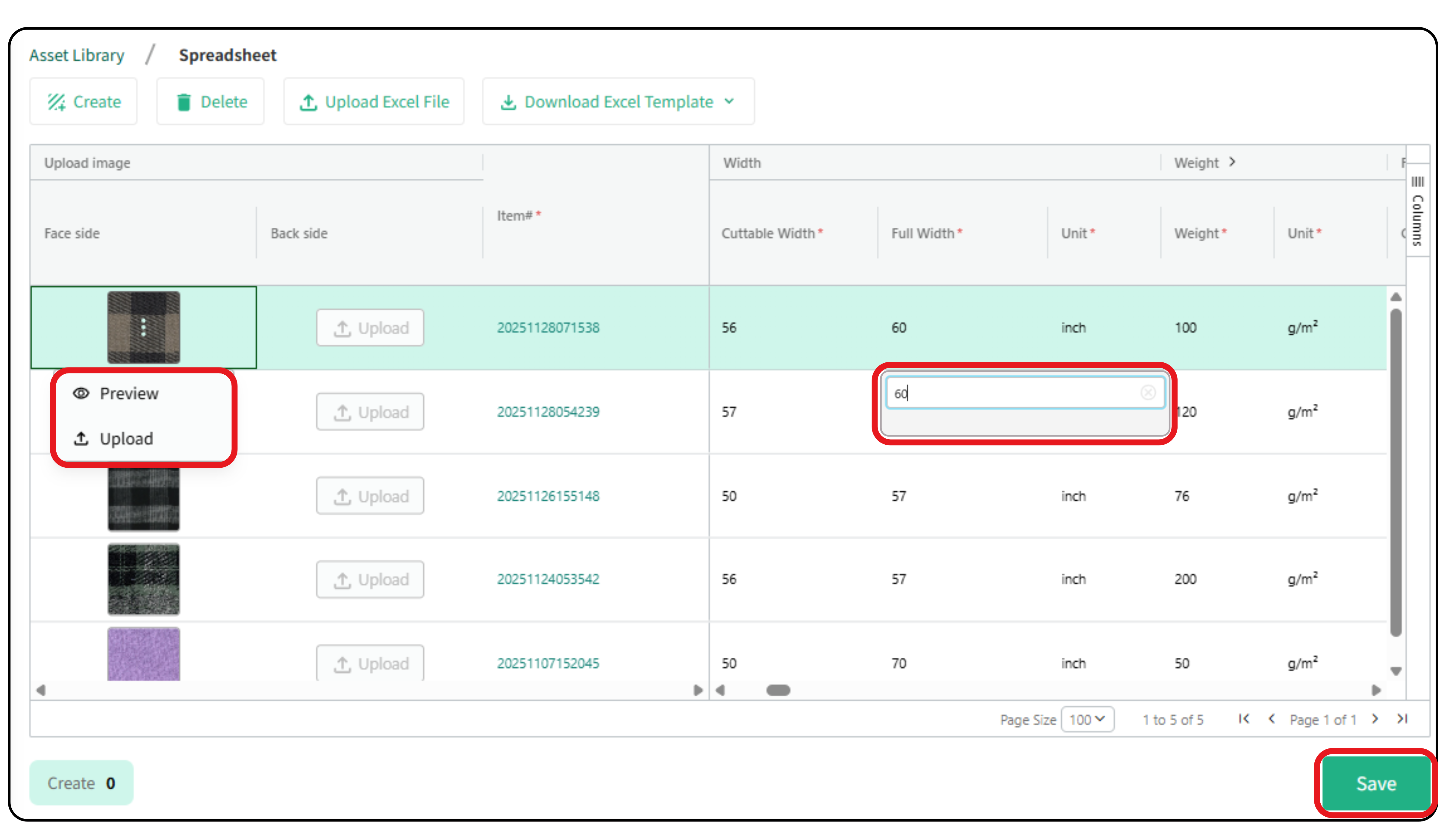 - Directly edit and update the mass fabric data in the spreadsheet by double-clicking on the desired data column. You can aslo update the pre-scanned fabric image here.