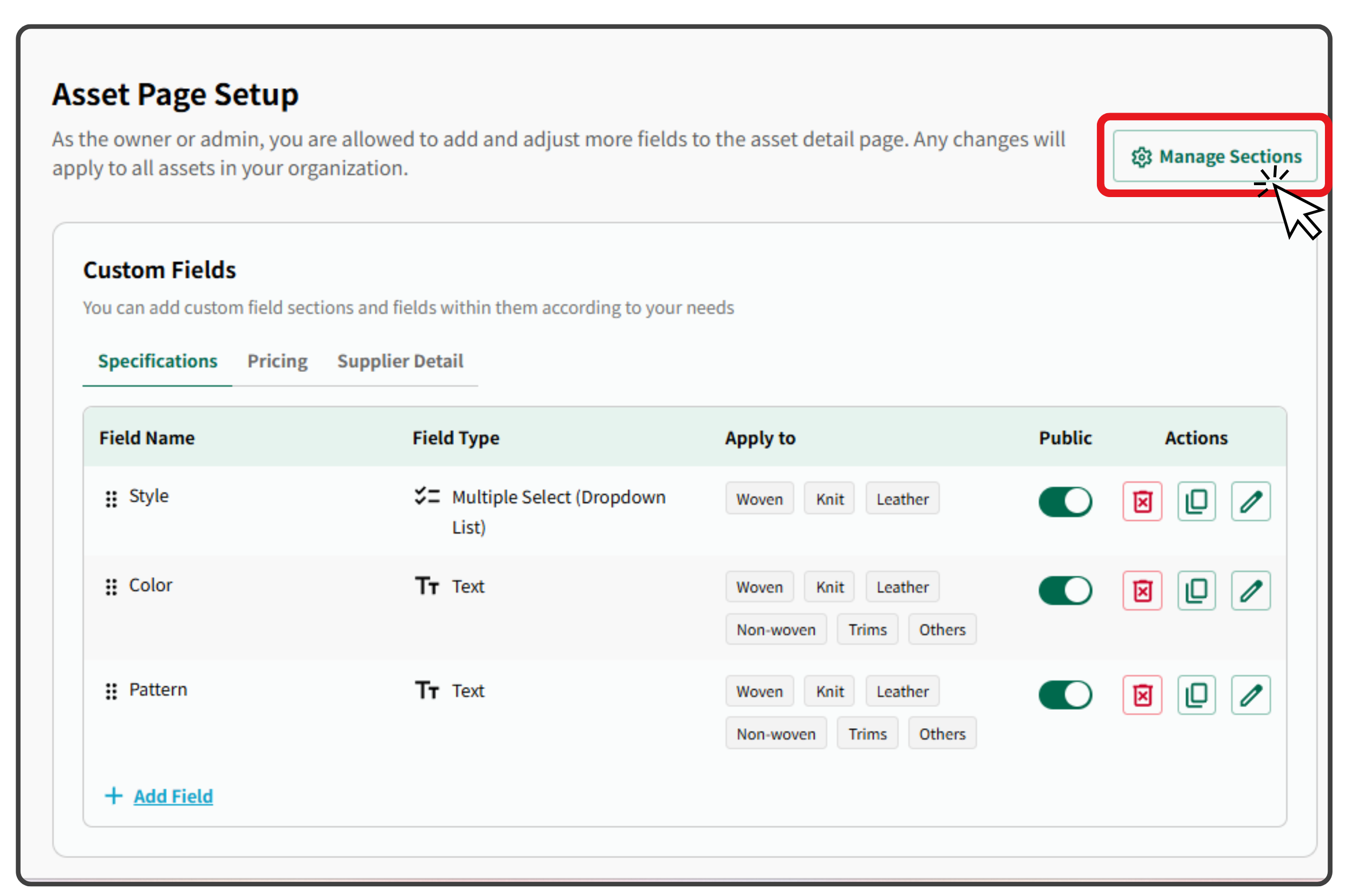 📌 When you select a material type (e.g., Woven), the custom field will apply to all assets labeled with that type. Additionally, you can select multiple material type for one custom field. - Visibility Controls = who can see the field, for Public it will be visible to all internal users (org owner, admin, member, and guest), while for Private, it will be only visible to org owner, admin(s) and member(s).