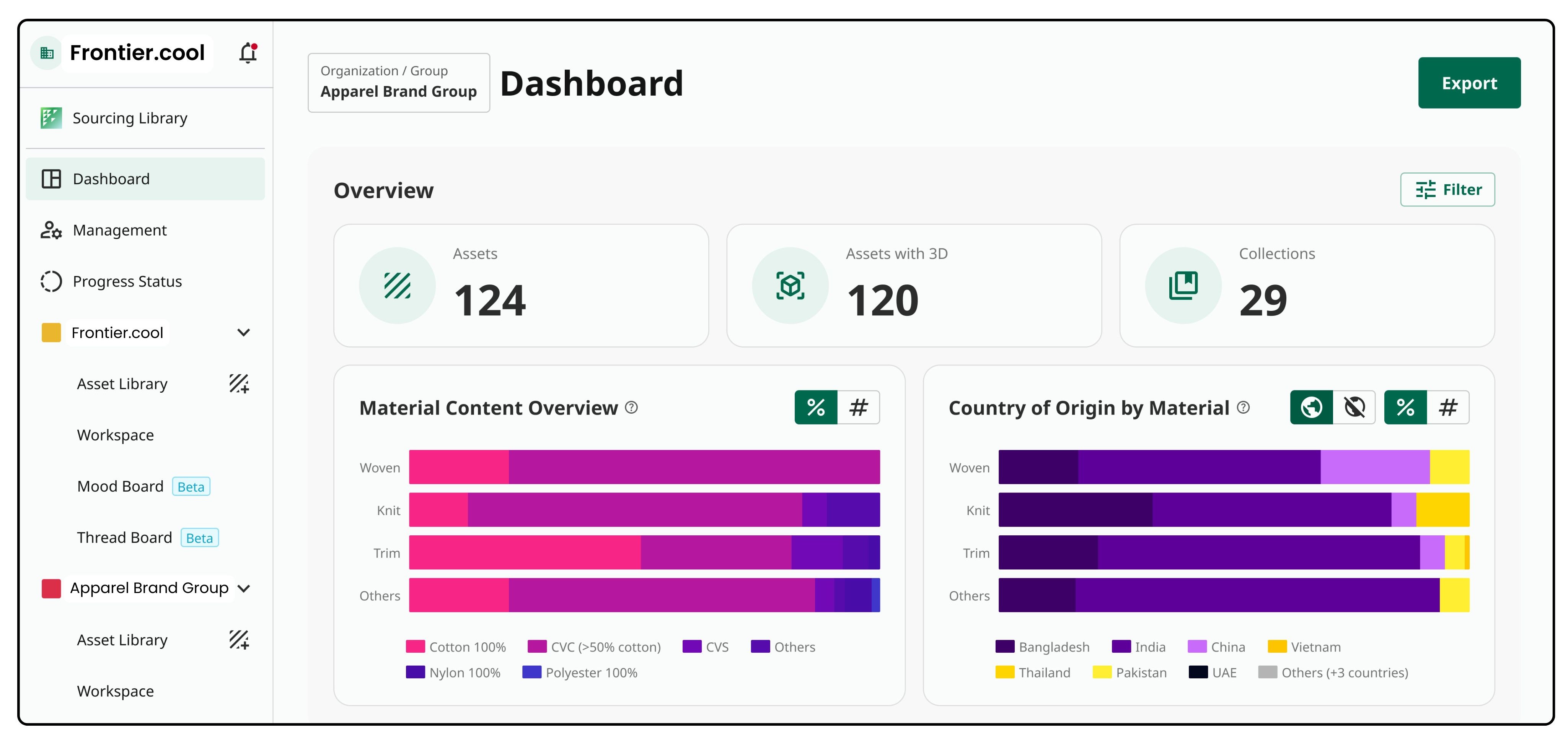 The Dashboard is a powerful tool that provides Organization Owners with a comprehensive overview of key activities and performance metrics. By monitoring fabric uploads, 3D material creation, collection engagement, and sustainability efforts, organizations can make data-driven decisions to enhance their digital material strategy. This feature ensures transparency and efficiency, enabling teams to optimize their workflow within the platform.